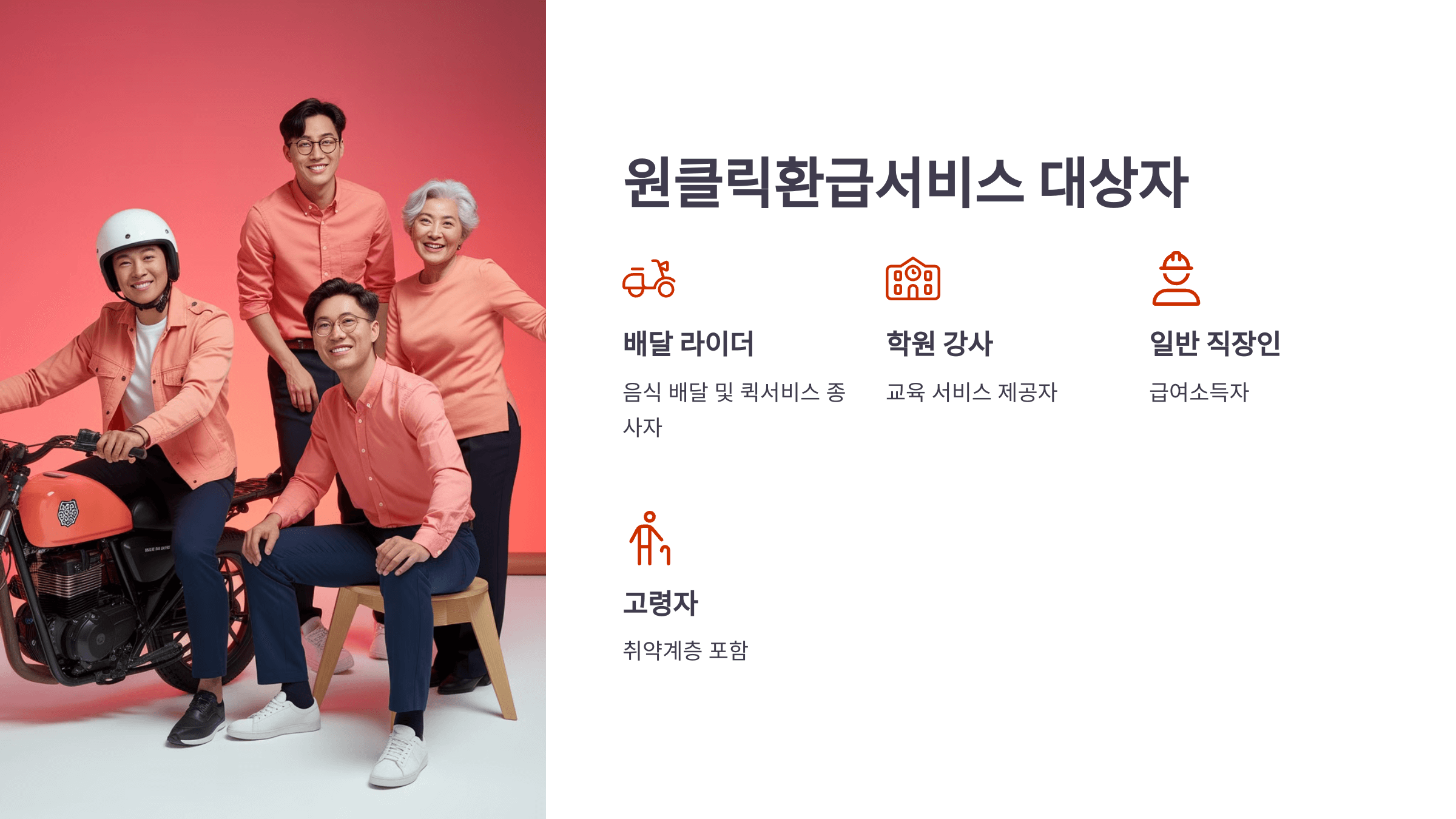 - 배달 라이더, 학원 강사, 일반 직장인, 고령자 등