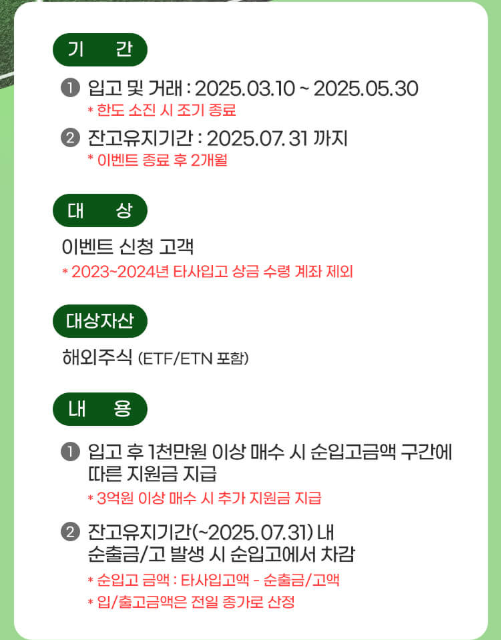 해외주식 보유하고 계신가요? 타 증권사 계좌에 있는 해외주식을 대신증권으로 옮기기만 해도 최대 300만원 지원금을 받을 수 있는 특별한 이벤트가 열렸습니다. 거래만 하면 현금 리워드까지 따라오는 대신증권의 통 큰 이벤트, 자세한 내용을 안내드립니다.