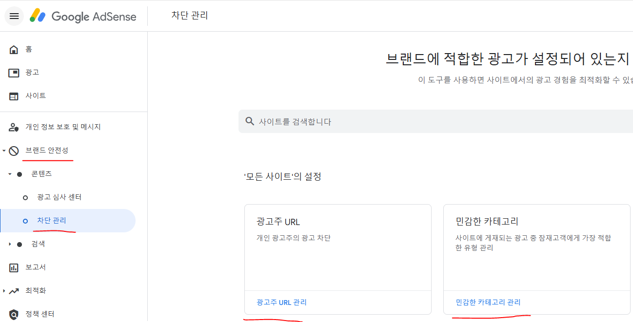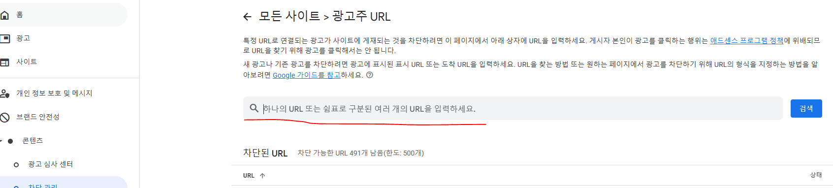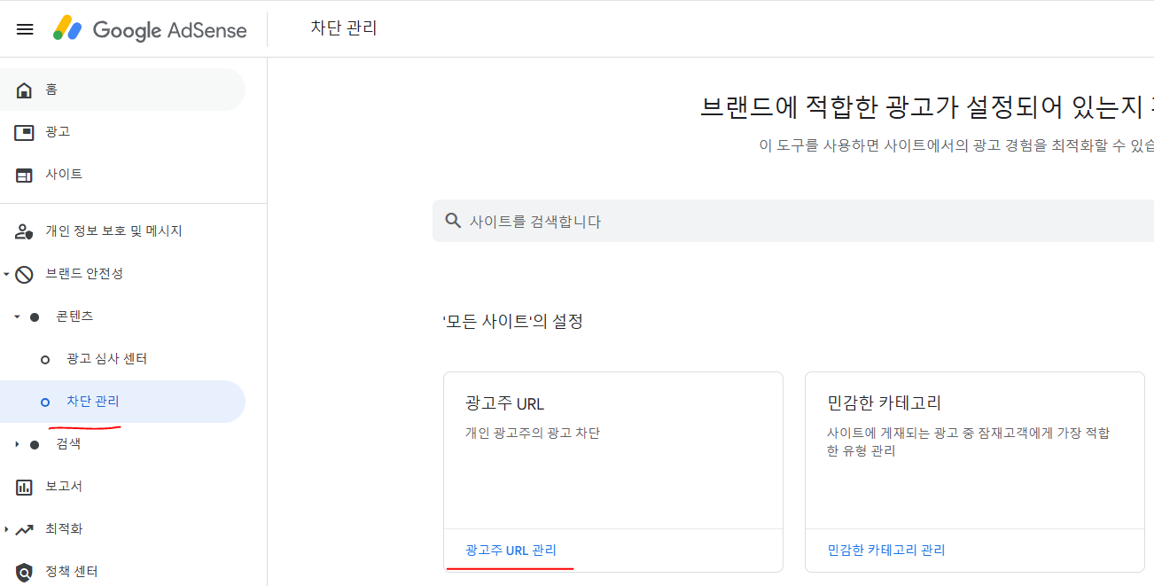 5. 구글 애드센스 홈페이지에서 차단관리 중 광고주 URL 관리를 클릭합니다.