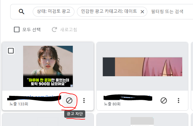 첫번째 처음에 민감한 카테고리에서 광고를 찾아서 차단을 하고